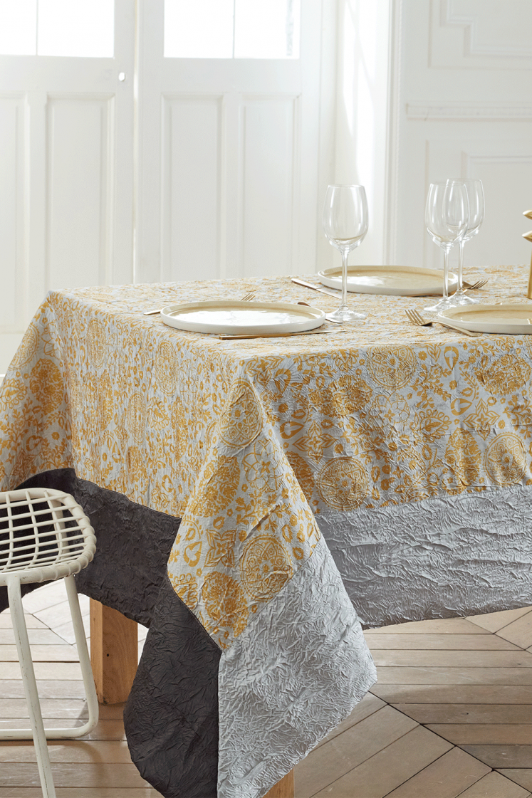 La nappe Cashemire offre une subtile élégance avec ses motifs géométriques jaunes délicatement posés sur un fond blanc. Bordée de bandes grises et noires, elle se distingue par son raffinement discret. En taffetas froissé, elle reste facile à entretenir, avec un séchage rapide et aucune nécessité de repassage. Attention : ne pas repasser le taffetas.