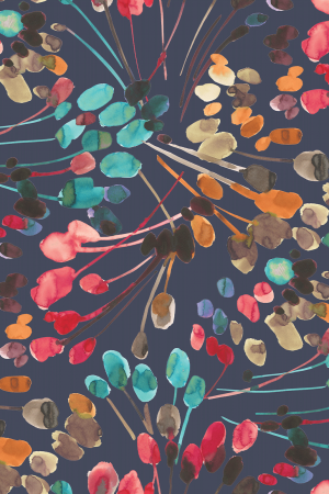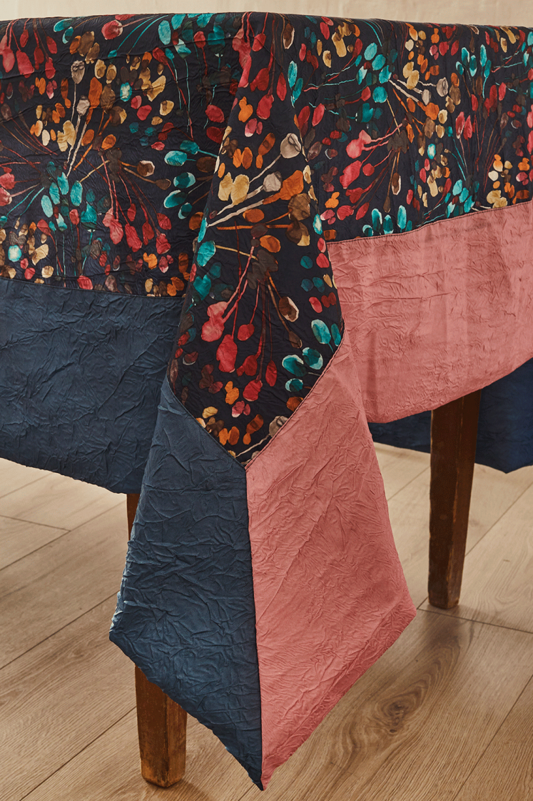 Le modèle Mazzo se distingue par son tissu bleu marine orné de motifs fantaisie rouge, orange et bleu, évoquant des fleurs en tige. Bordée de bandes rose et bleu marine, cette nappe chic et intemporelle en taffetas froissé est idéale pour des repas élégants tout en restant facile à entretenir. Les taches s’enlèvent facilement et elle sèche rapidement sans nécessiter de repassage. Attention : ne pas repasser le taffetas.