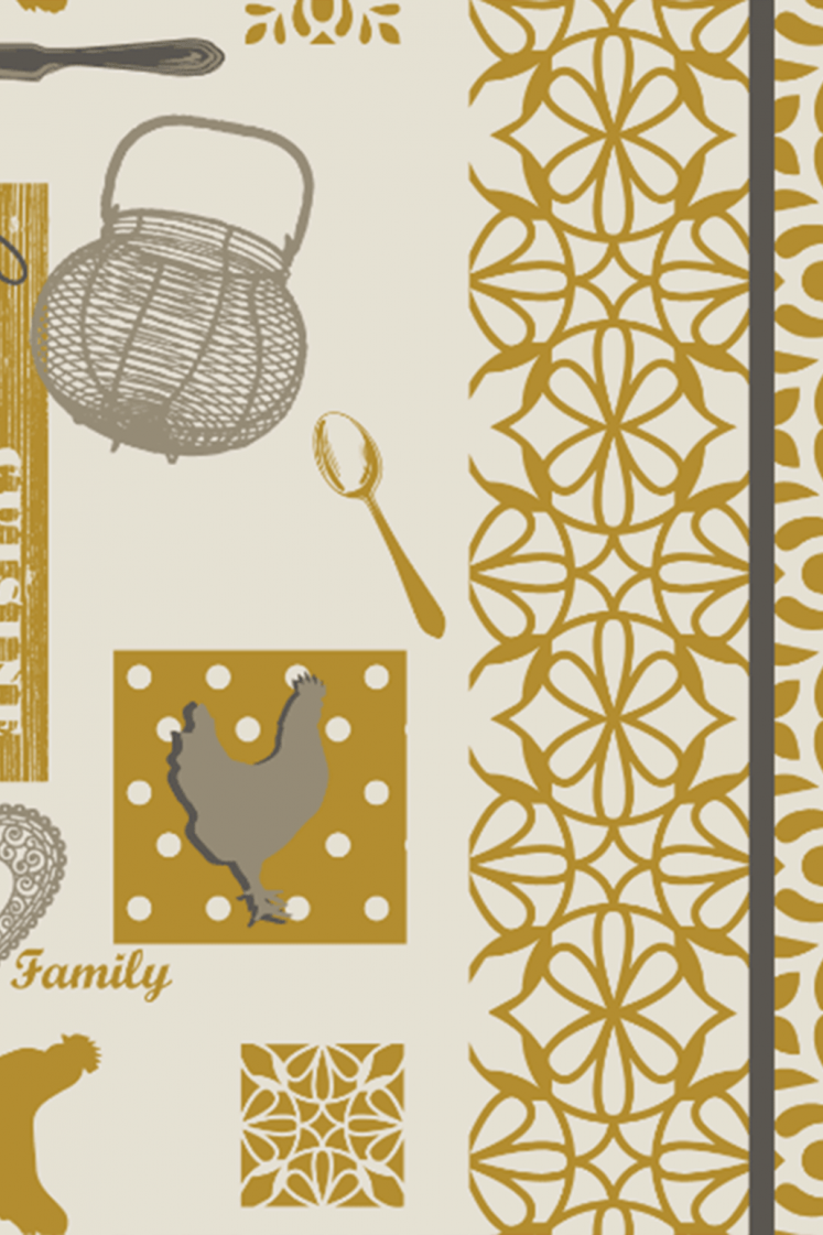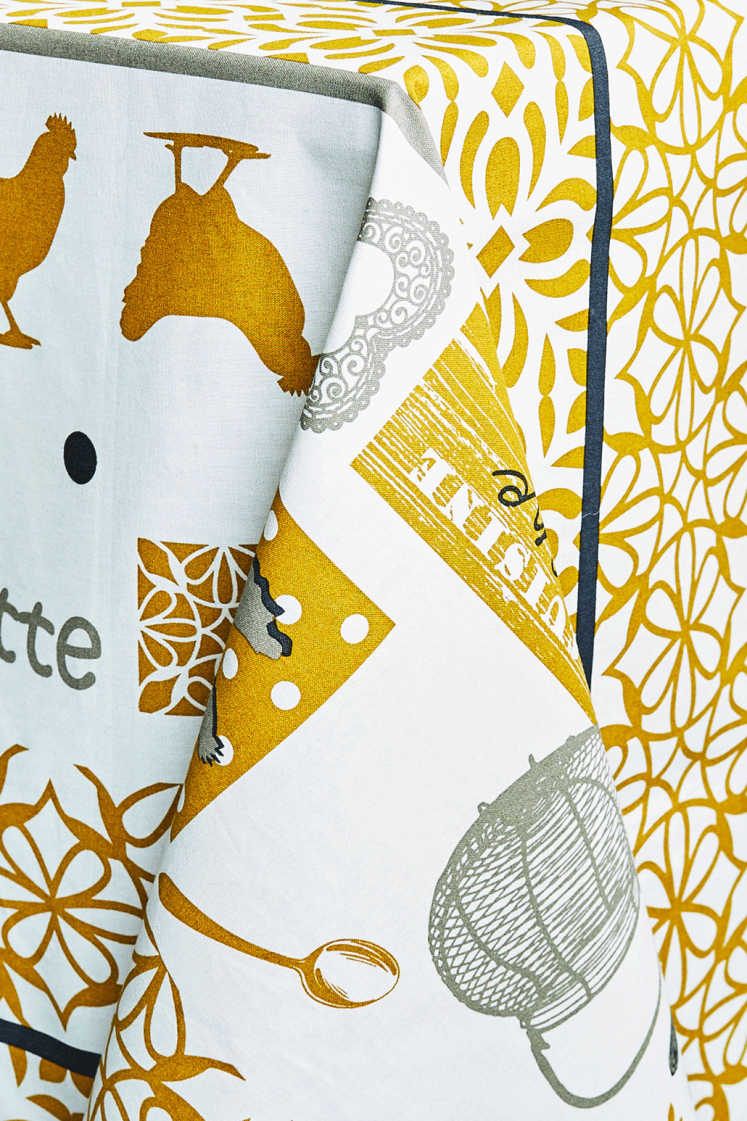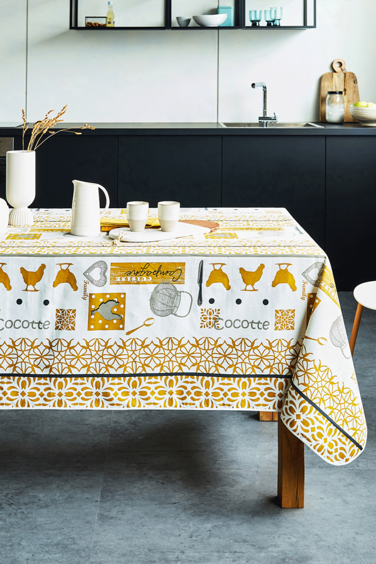La nappe Cocotte est parfaite pour une ambiance champêtre avec ses petits dessins de poules et ses symboles rustiques comme des cuillères et des cœurs. Son design chaleureux et accueillant est idéal pour une maison de campagne ou un décor convivial.