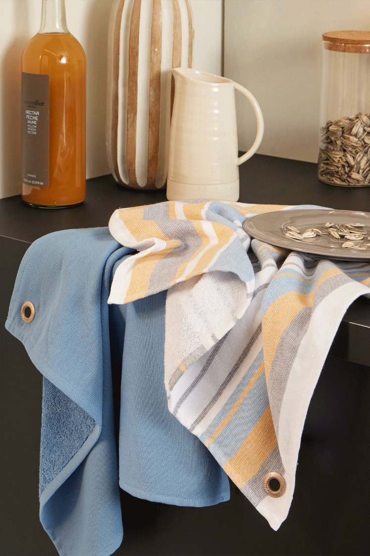 Ce lot de 2 carrés éponge est idéal pour essuyer vos mains au quotidien. Il comprend un carré uni coloris bleu et un autre rayé curry, blanc, bleu et gris. Confectionnés en 100 % coton avec une face éponge bouclette, ils offrent une excellente absorption et un toucher doux. Les finitions ourlet assurent leur durabilité, et l'œillet effet vieilli gravé « NYDEL Paris » permet de les suspendre facilement. Garantis grand teint, ils conservent leur éclat lavage après lavage.