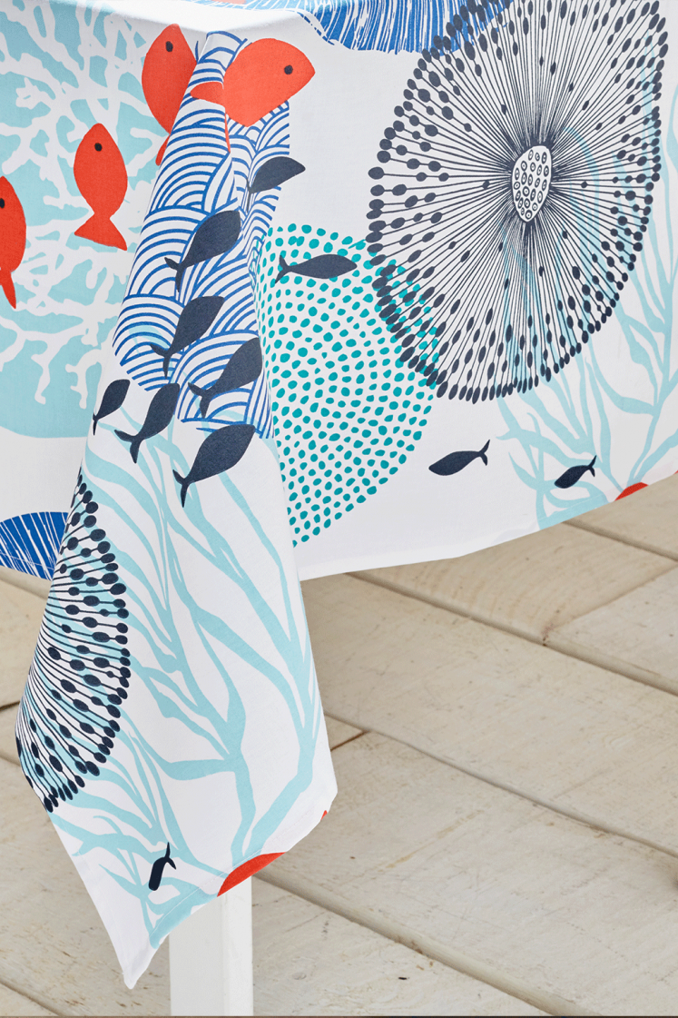 Plongez dans l’univers marin avec la nappe Nautique. Inspirée des fonds marins, elle se pare de motifs vibrants de coraux, d’anémones, d’étoiles de mer et de petits poissons, pour un effet pep’s et coloré. Cette nappe moderne apporte une touche vivante et dynamique à votre table, transformant chaque repas en une véritable escapade océanique. Idéale pour ceux qui cherchent à ajouter du caractère et de la fraîcheur à leur décor.