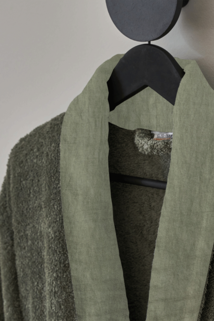 Peignoir en éponge moelleuse et enveloppante aux élégantes finitions ton/ton en chanvre et coton bio.