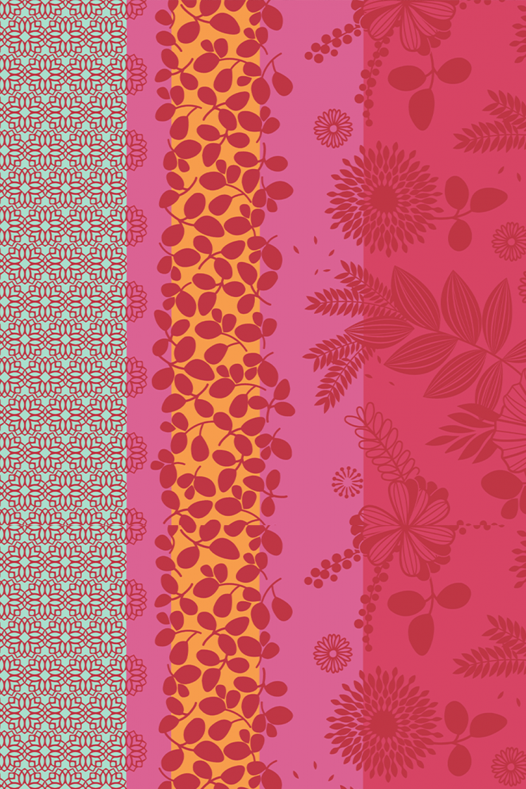 La nappe Jardin d’Été présente des motifs floraux en son centre, réalisés avec précision grâce au tissage jacquard. Le tombé est décoré de bandes géométriques orientales dans des tons fuchsia, apportant un style unique et vibrant à vos repas estivaux.