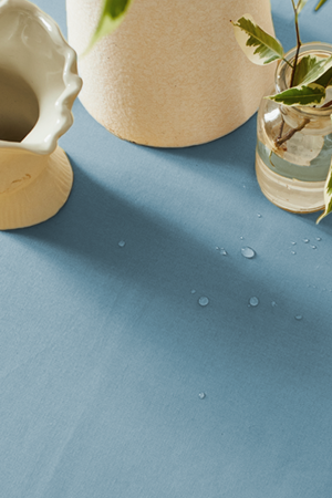 Pour la rendre déperlante, nous utilisons la technologie de l’enduction acrylique, qui consiste à enduire le tissu grâce à une fine couche de téflon et une résine fluorée bio. Ainsi, votre nappe conserve la texture en relief du tissu. Les liquides perlent sur la surface et un coup d’éponge suffit à les nettoyer.