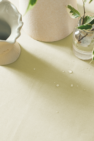 Pour la rendre déperlante, nous utilisons la technologie de l’enduction acrylique, qui consiste à enduire le tissu grâce à une fine couche de téflon et une résine fluorée bio. Ainsi, votre nappe conserve la texture en relief du tissu. Les liquides perlent sur la surface et un coup d’éponge suffit à les nettoyer.