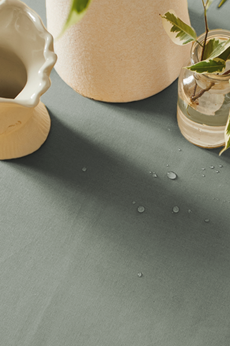 Pour la rendre déperlante, nous utilisons la technologie de l’enduction acrylique, qui consiste à enduire le tissu grâce à une fine couche de téflon et une résine fluorée bio. Ainsi, votre nappe conserve la texture en relief du tissu. Les liquides perlent sur la surface et un coup d’éponge suffit à les nettoyer.