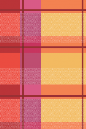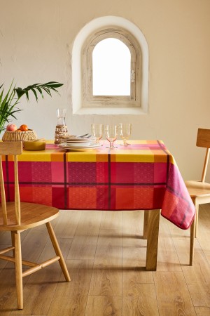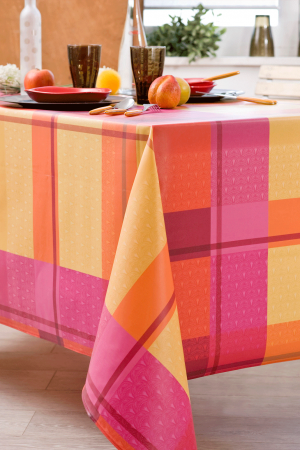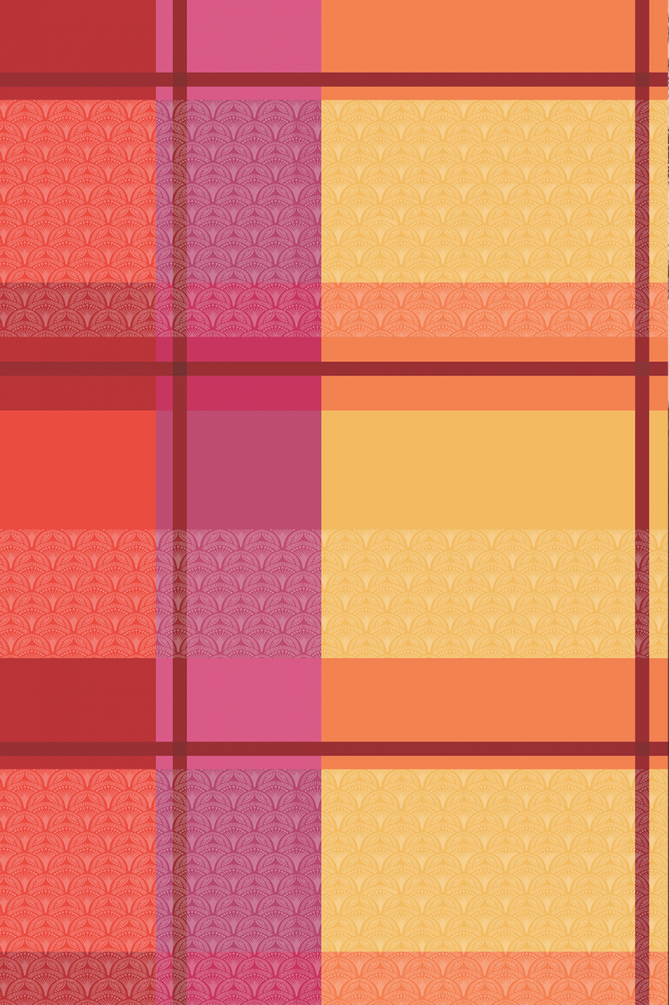 La nappe Indila se distingue par ses bandes superposées de couleurs vives, mêlant des teintes de jaune, d'orange et de framboise. Ce motif audacieux et pétillant forme des carreaux dynamiques, apportant une touche de peps et d’énergie à votre table. Parfaite pour insuffler de la gaieté à vos repas.